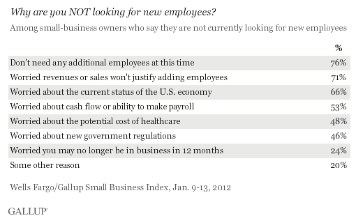 According to Politico, “an overwhelming majority of small-business owners surveyed” by Gallup – 85 percent – aren’t currently hiring. Among them, 48 percent cited concerns about rising health care costs and 46 percent cited new government regulations.”